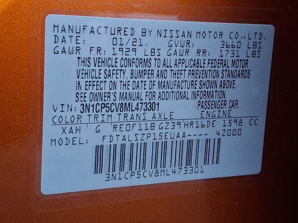 Certified. *SUBARU CERTIFIED*, *BLUETOOTH*, *USB*, *SATELLITE RADIO*, *BACK UP CAMERA*, *BLIND SPOT MONITOR*, Kicks SV, 4D Sport Utility, 1.6L 4-Cylinder DOHC 16V, CVT with Xtronic, Monarch Orange/Super Black, Charcoal Cloth, 6 Speakers, Apple CarPlay/Android Auto, Blind Spot Warning, Wheels: 17" 5-Hole Alloy. Check out all these great options Kicks SV, Nissan Certified Certified, 4D Sport Utility, 1.6L 4-Cylinder DOHC 16V, CVT with Xtronic, Monarch Orange/Super Black, Charcoal Cloth, 6 Speakers, Apple CarPlay/Android Auto, Blind Spot Warning, Wheels: 17" 5-Hole Alloy, 3.927 Axle Ratio, 4-Wheel Disc Brakes, ABS brakes, Air Conditioning, Alloy wheels, AM/FM radio: SiriusXM, Auto High-beam Headlights, Automatic temperature control, Brake assist, Bumpers: body-color, Carpeted Floor Mats w/Cargo Mat, Cloth Seat Trim, Compass, Driver door bin, Driver vanity mirror, Dual front impact airbags, Dual front side impact airbags, Electronic Stability Control, Front anti-roll bar, Front Bucket Seats, Front Center Armrest, Front reading lights, Front wheel independent suspension, Fully automatic headlights, Heated door mirrors, Illuminated entry, Knee airbag, Low tire pressure warning, Occupant sensing airbag, Outside temperature display, Overhead airbag, Panic alarm, Passenger door bin, Passenger vanity mirror, Power door mirrors, Power steering, Power windows, Radio data system, Radio: AM/FM Audio System, Rear Parking Sensors, Rear reading lights, Rear side impact airbag, Rear window defroster, Rear window wiper, Remote keyless entry, Roof rack: rails only, Speed control, Splash Guards Grain (4 Piece), Split folding rear seat, Sport steering wheel, Steering wheel mounted audio controls, Tachometer, Telescoping steering wheel, Tilt steering wheel, Traction control, Trip computer, and Variably intermittent wipers.